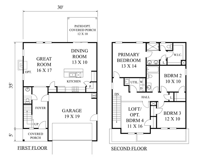 | This starter house packs four bedrooms into a compact 30 x 40 foot envelope. The first floor is an open plan with the island kitchen open to generous family room and dining areas. Upstairs there are 4 bedrooms and and a convenient laundry room. The front elevation features a covered entry porch and stone veneer accents. It is documented with a slab foundation. The plan is not available in the Charlotte, NC market. |