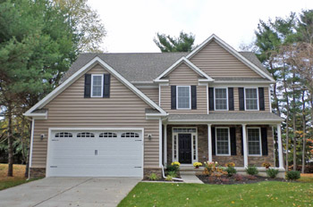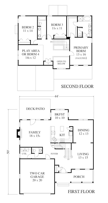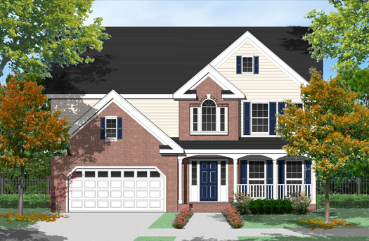 | This classic floor plan arrangement fits in a 44 foot footprint that includes a two car garage. Outside, the porch and roof gables offer an engaging street presence in spite of its narrow width. Inside, the plan has large living and dining rooms to one side and a large family room on the other, with the kitchen in the center of the plan. Upstairs is a pleasing three bedroom/two bath arrangement that includes an open loft area. This plan is documented with a basement foundation. |